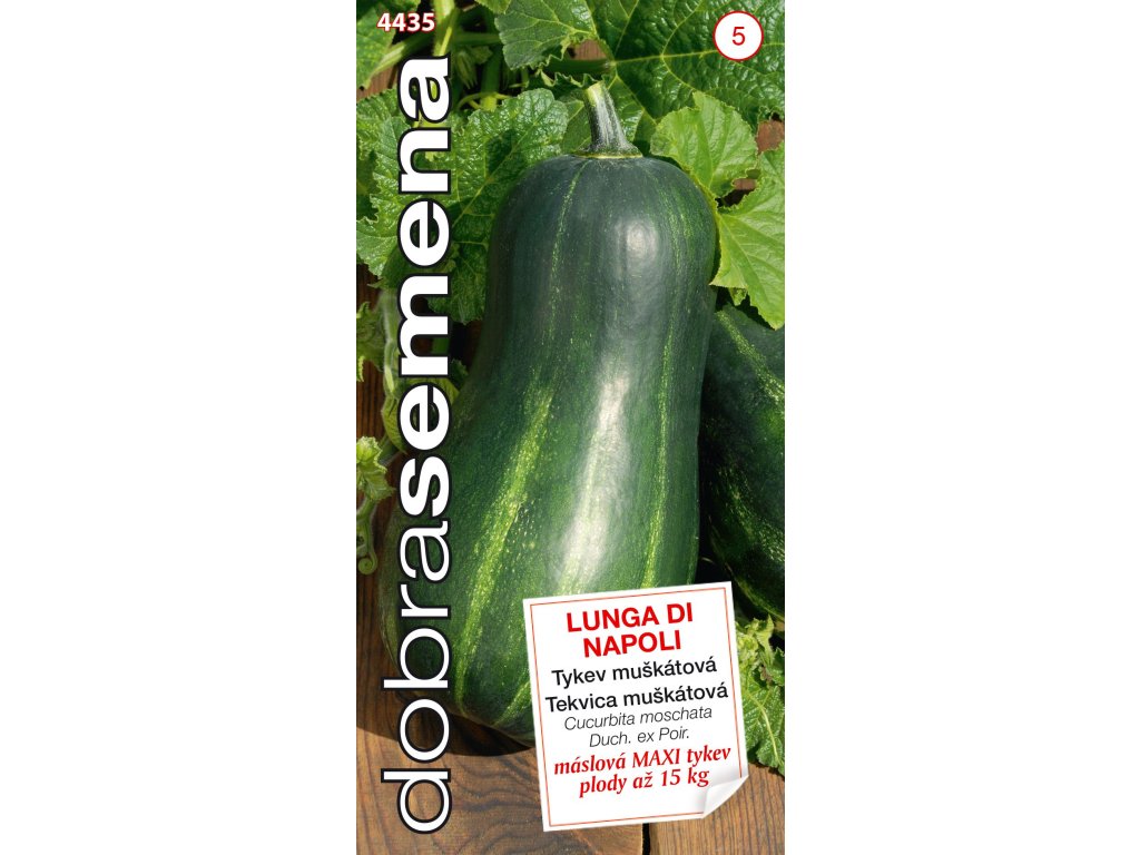 LUNGA DI NAPOLI - plazivá muškátová (máslová) tykev s velkými plody dorůstajícími až do 15 kg. Plod je kyjovitý, podlouhlý, s tmavě zelenou slupkou a se semeny pouze ve vrcholové části. Dužnina je sytě oranžová, velice chutná, kompaktní a středně pevná. Vosková vrstvička na povrchu plodu zajišťuje dobrou skladovatelnost. Plody skladujte v suchu při teplotě nad 12 stupňů celsia.