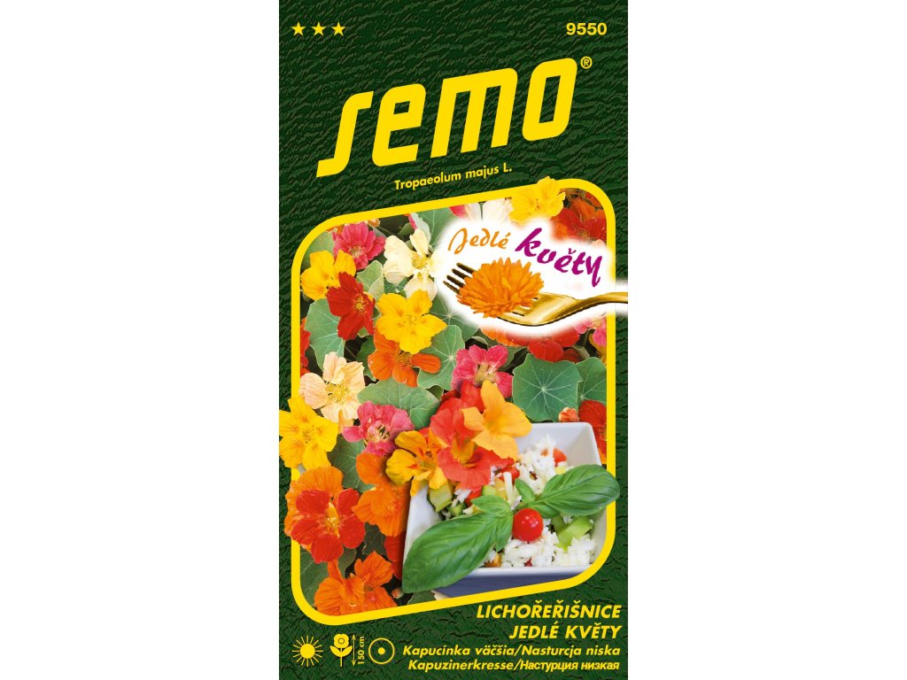 Lichořeřišnice větší - kolekce JEDLÉ KVĚTY - květy ve směsi barev od krémově bílé, přes žlutou, oranžovou až po jasně červenou, patří mezi nejpopulárnější jedlé květy. Mají výrazně pikantní řeřichovou chuť a vynikají jako ozdoba zeleninových salátů.