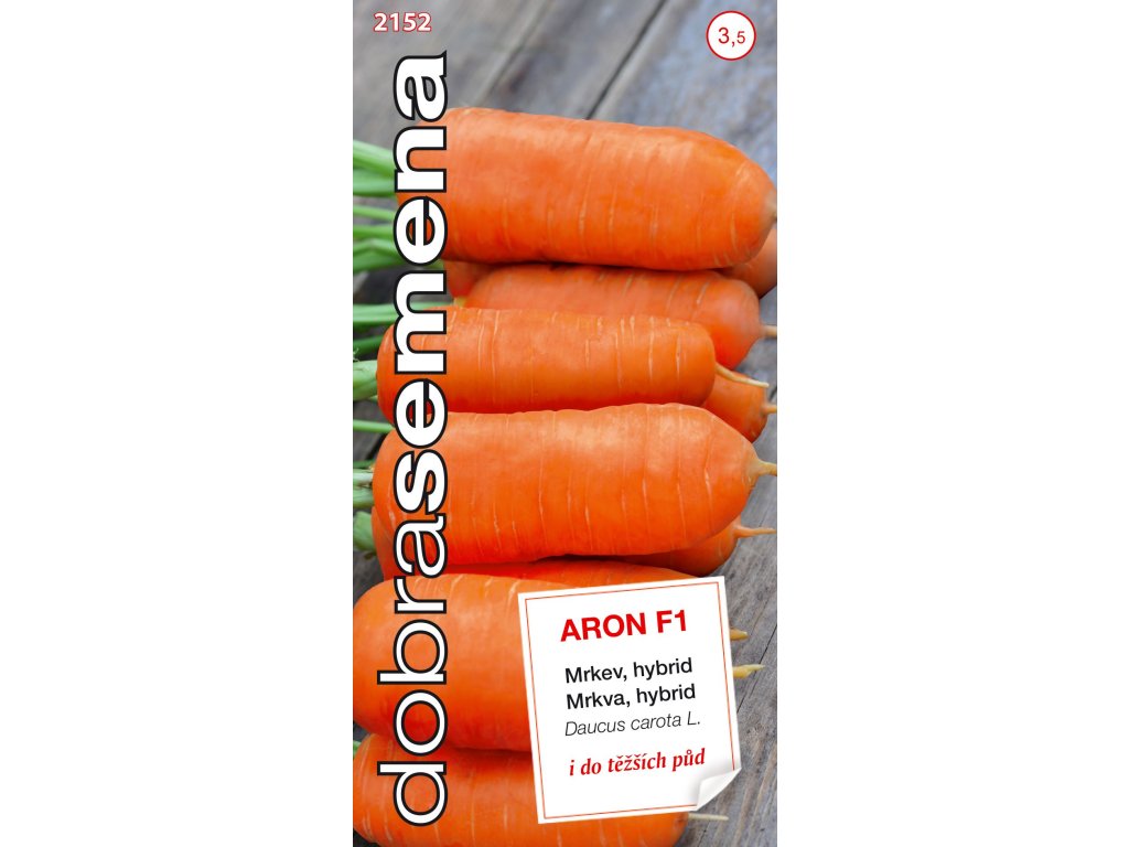 Aron F1 - velmi raná hybridní mrkev s krátkým, pouze 10 cm dlouhým kořenem. Je vhodná i pro pěstování v těžších půdách. Kořen je válcovitý, pravidelný, s tupým zakončením. Dřeň i kůra kořene jsou oranžové, hlava kořene nezelená ani nefialoví.