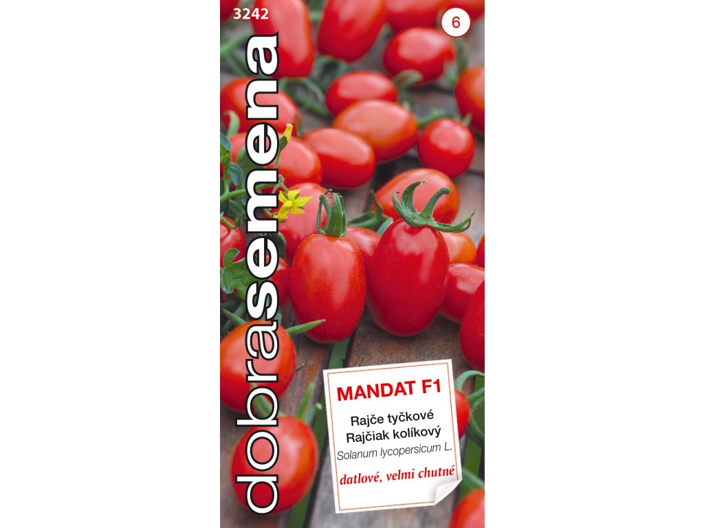 MANDAT F1 - hybridní datlové rajče s výborným výnosem. Hrozny jsou větvené, dlouhé, nesoucí i 30 drobných plodů. Plody jsou chutné, odolné k praskání. Odrůda.která skutečně zaujala svým potenciálem.