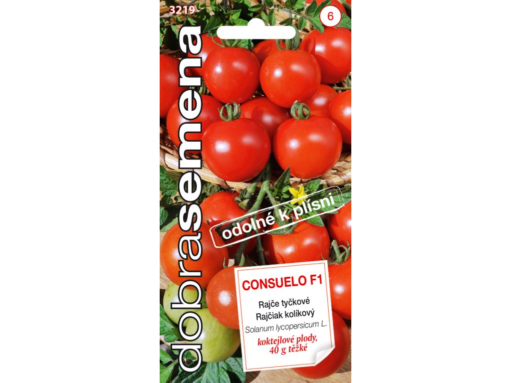 CONSUELO F1 - tyčkové rajče s vysokou odolností k plísni. Středně velké "koktejlové" plody o hmotnosti cca 40 g. Dozrávají do jasně červené barvy. Bohaté a dlouhé vijany nesou až 30 plodů. Rajče, které je velikostí, barvou i chutí nejbližší odrůdě BEJBINO. Tyčkový hybrid s výbornou odolností k plísni. Chemickou ochranu můžete omezit na minimum a tím získat skutečně zdravá rajčata.