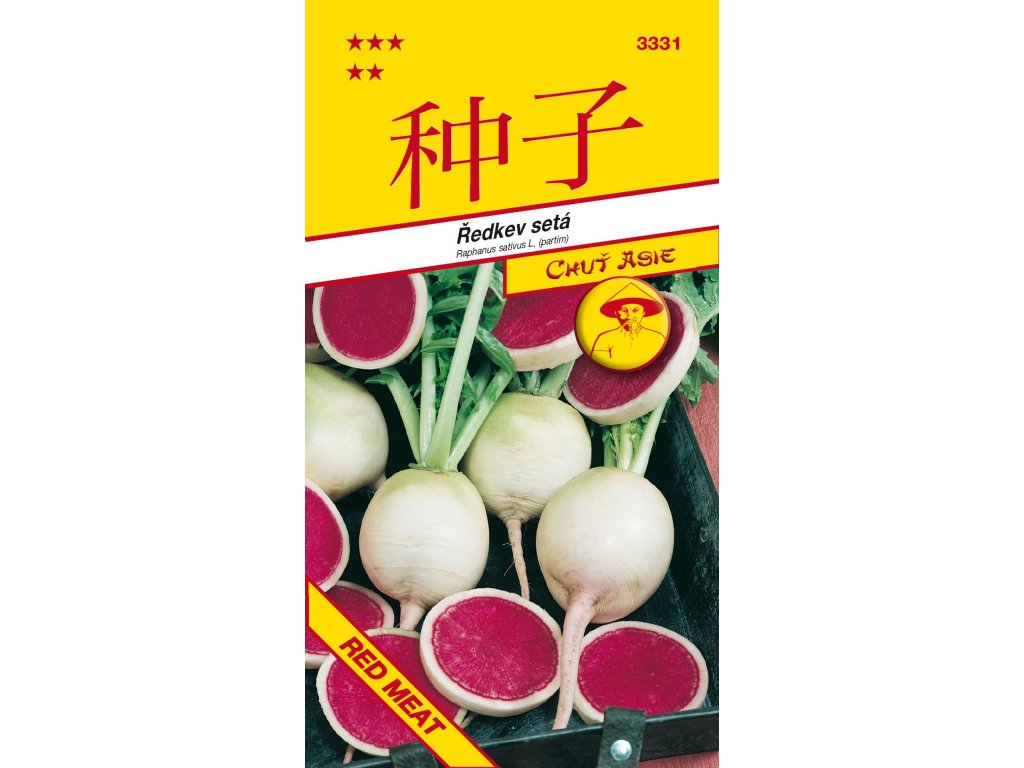 RED MEAT - kolekce CHUŤ ASIE – ředkev k podzimnímu pěstování s výsevem od poloviny července. Bulva má na povrchu zelenošedou pokožku, jemná dužnina rubínově červené barvy má jemnou, výraznou chuť. Je určena pro přímý konzum a vzhledem k atraktivní barvě na řezu je i zajímavou oblohou. Odrůda je středně skladovatelná.
